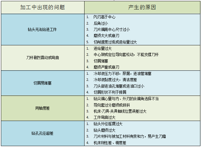 6. 槍鉆加工中常遇到的問(wèn)題和產(chǎn)生的原因見(jiàn)下表: