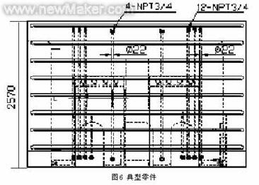 例1:一典型零件(見圖6),有16個Φ22通孔,長度達(dá)到2550mm。在沒有使用槍鉆前,類似的深孔加工將會耗費(fèi)機(jī)床25天的時間來完成,而且質(zhì)量往往得不到保證,現(xiàn)在采用槍鉆后僅用了250小時就高質(zhì)量的完成了工件上所有深孔的加工,取得了良好的應(yīng)用效果。