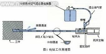 專業(yè)的槍鉆系統(tǒng)由深孔鉆機(jī)、單刃或雙刃的槍鉆及高壓冷卻系統(tǒng)組成(見圖1)。槍鉆柄部被夾持在機(jī)床主軸上,,鉆頭通過導(dǎo)引孔或?qū)走M(jìn)入工件表面,進(jìn)入后,鉆刃的獨(dú)特結(jié)構(gòu)起到自導(dǎo)向的作用,保證了切削精度。這時冷卻液通過鉆頭中間的通道到達(dá)切削部位,并將切屑從排屑槽帶出工件表面,同時對鉆刃進(jìn)行冷卻和對背部的支撐凸臺進(jìn)行潤滑,從而獲良好的加工表面和加工質(zhì)量。
