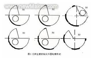 鉆刃是整個槍鉆的關(guān)鍵部分,其獨(dú)特科學(xué)的組合結(jié)構(gòu)保證在完成切削工作同時還起到自導(dǎo)向的作用, 可以通過一次貫穿得到一個高精度的深孔。鉆刃有兩個基本度,可以根據(jù)被切削工件的材料及形式來選擇最恰當(dāng)?shù)慕M合,以便于工作更好的平衡切削力和斷屑,并將切削力傳遞給支撐凸肩,保證良好的直線度和同軸度。鉆刃有很小的倒錐度并且直徑較刀身略大,可以保證鉆身可以在切削孔內(nèi)自由旋轉(zhuǎn)而不會磨擦孔內(nèi)壁的切削表面,根據(jù)不同要求,刃部有單圓孔、腎型孔和雙圓孔的通道同刀身的油道連接,高壓的冷卻液可以通過此通道到達(dá)切削點(diǎn),并將切屑帶出工件。鉆刃支撐的幾種主要的外圓輪廓形式(見圖3):
