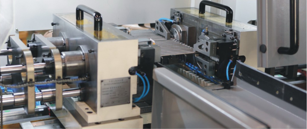 該機(jī)床采用四軸對進(jìn)式加工,進(jìn)口氣動自定心求心夾具裝夾,通過一次安裝即可完成高精度臺階孔的加工,并具備極高的入口位置精度。機(jī)床自動上料機(jī)構(gòu)單次最大安裝工件數(shù)量為22只,極大縮減了機(jī)床加工的輔助時間,效率極高。其一個加工循環(huán)的時間跨度合理,便于工廠進(jìn)行人員及生產(chǎn)安排,并大幅降低了工人勞動強(qiáng)度。